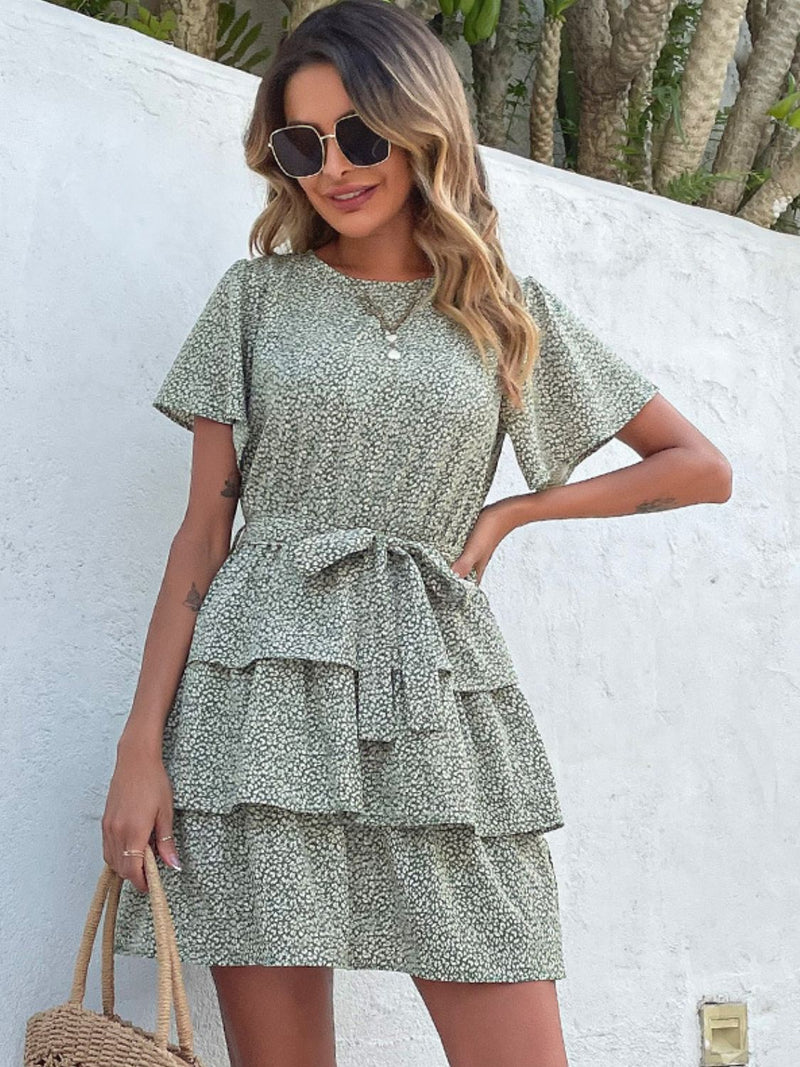 Printed V-Neck Tie Belt Ruffle Hem Mini Dress